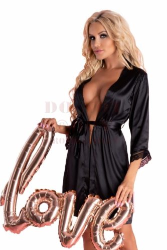Fényes selyemből készült fekete köntös csipkeszegéllyel és hozzá illő tangával.