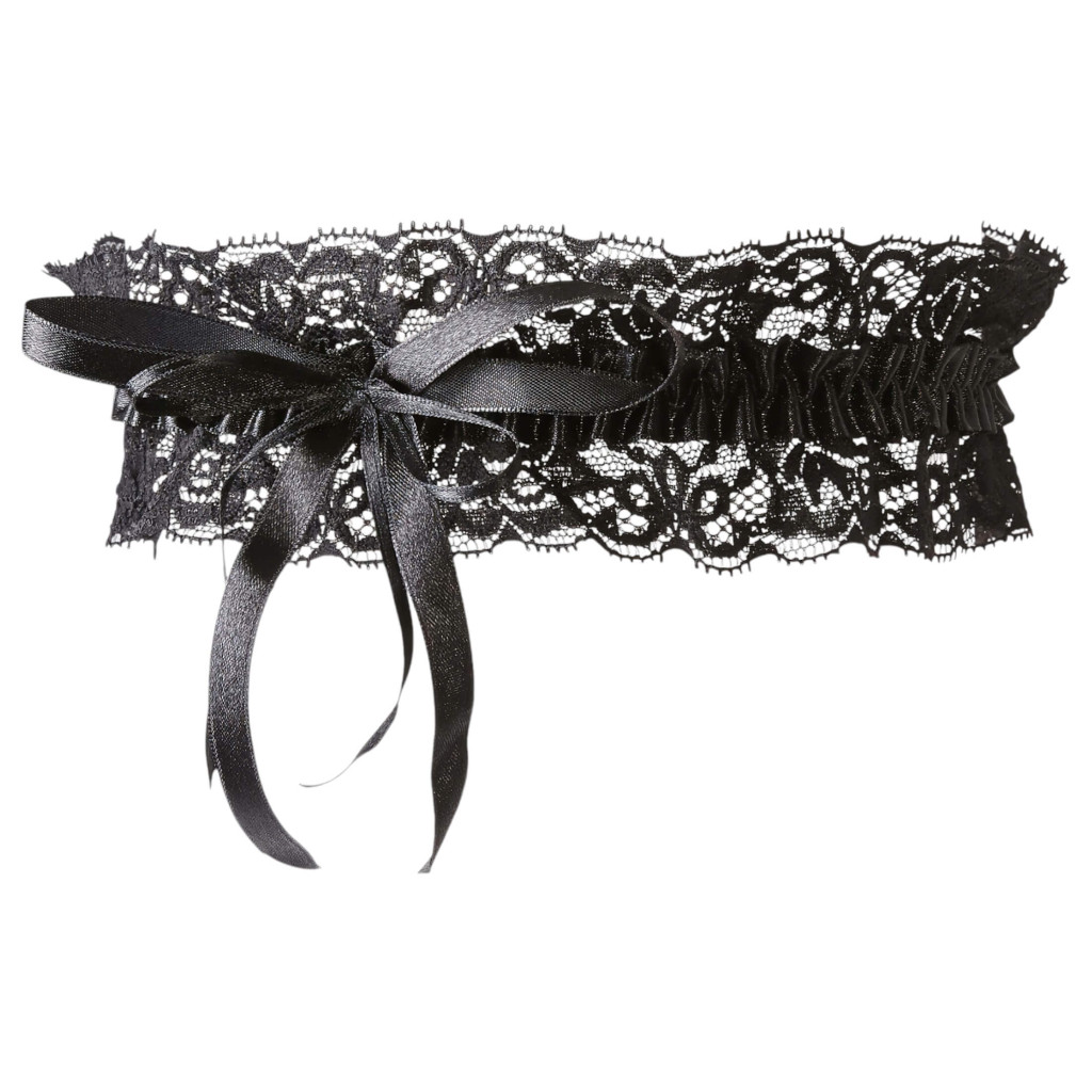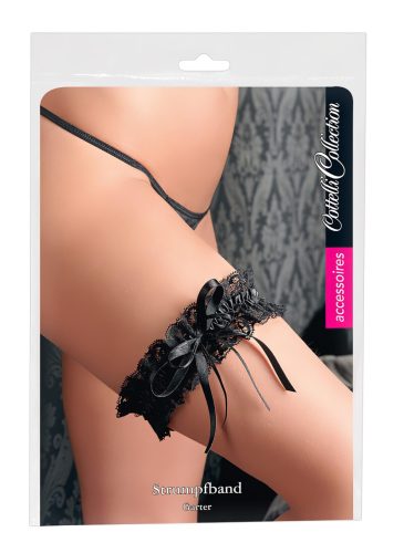Puha, rugalmas csipkéből készült fodros harisnyakötő, a középen végigfutó, csillogó, fekete szatén szalaggal díszítve.