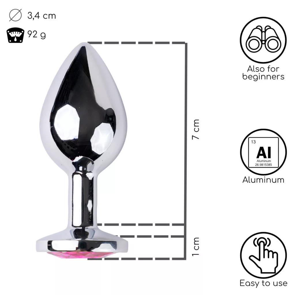 A kúpos, elkeskenyedő kialakítás lehetővé teszi a fokozatos és kényelmes behelyezést, míg a kiszélesedő, kör alakú talp maximális biztonságot nyújt. A talpat díszítő csillogó rózsaszín kő nemcsak látványos, hanem stabil fogást is biztosít, így a használat minden pillanatban kontrollált és magabiztos marad.