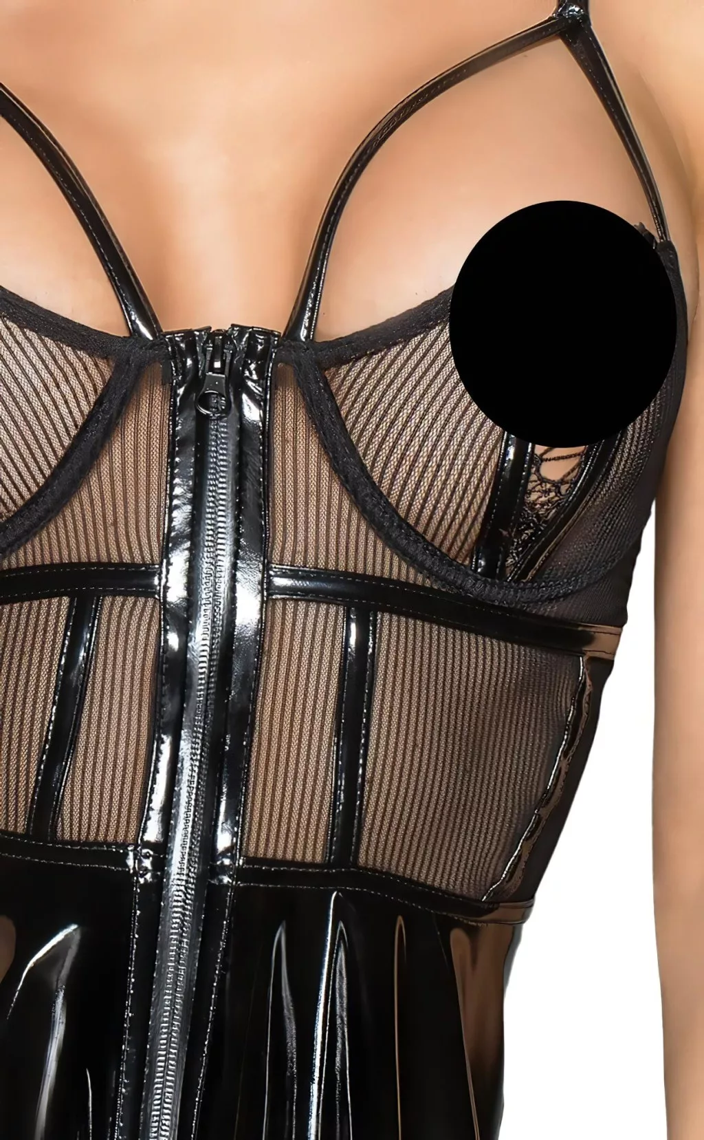 A felső részen teljesen áttetsző, anyagában csíkos neccből, alul pedig rakott hatású lakk anyagból készülő miniruha.