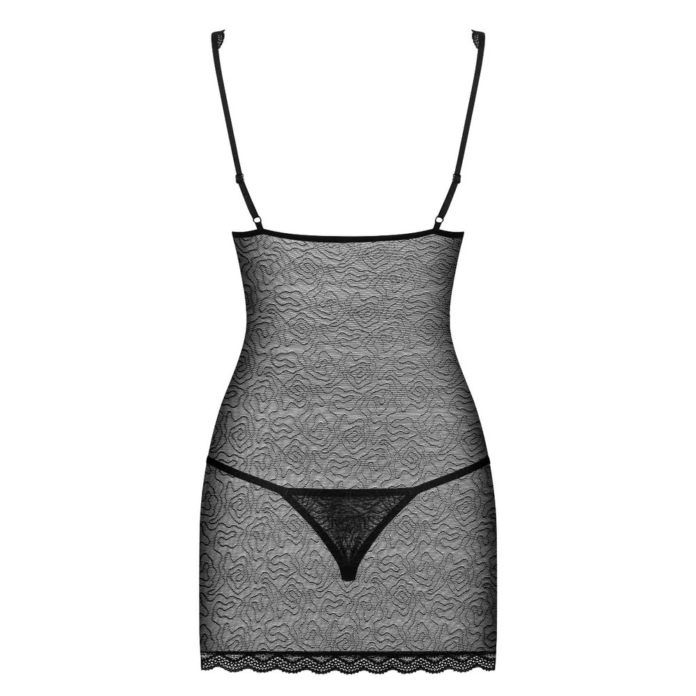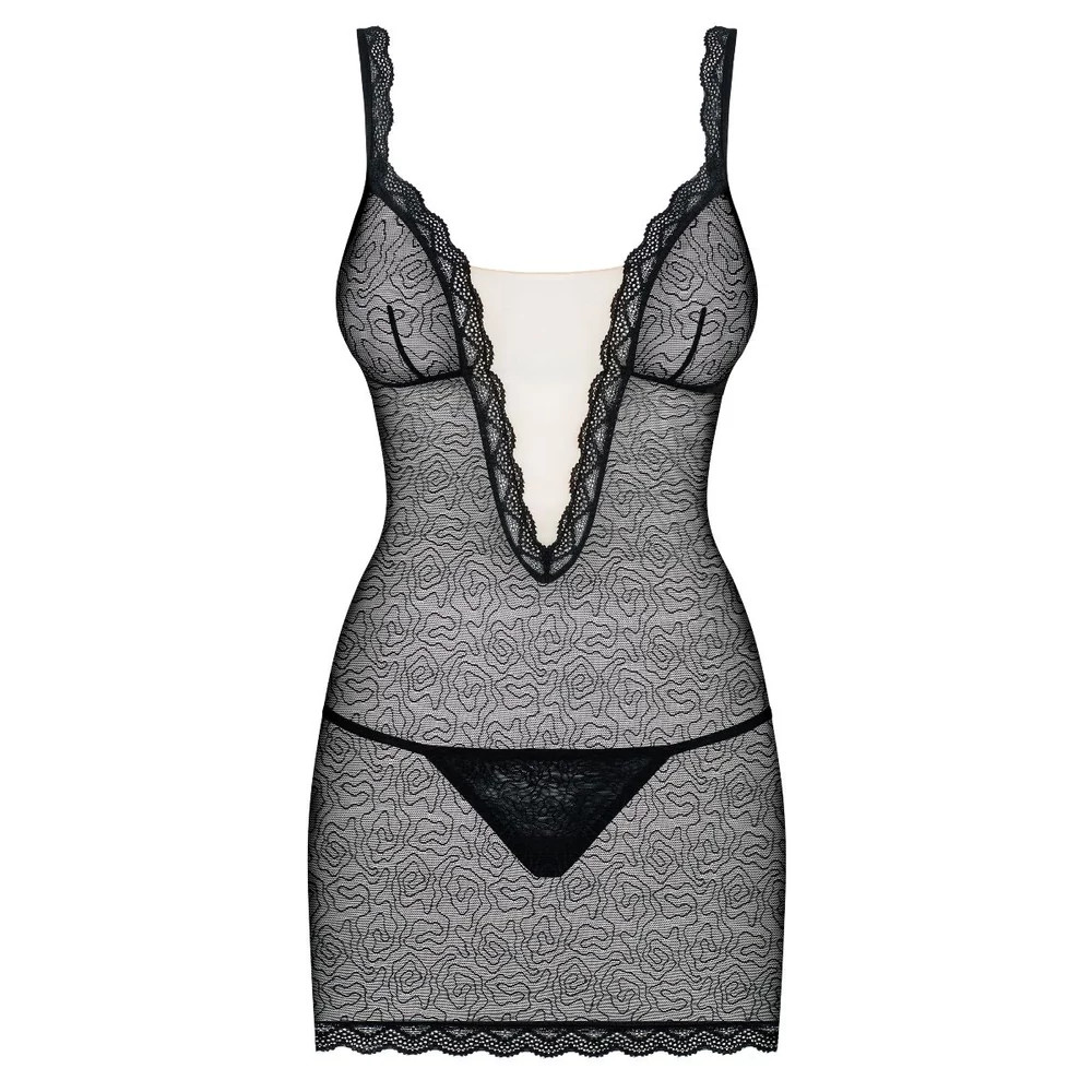 Testre simuló puha fekete csipkéből készült szexi hálóruha az Obsessive fehérnemű cégtől.Különlegessége a mellek között lévő áttetsző bézs színű betét,mely a dekoltázsra irányítja a figyelmet.A babydoll tartozéka a fekete tanga is.