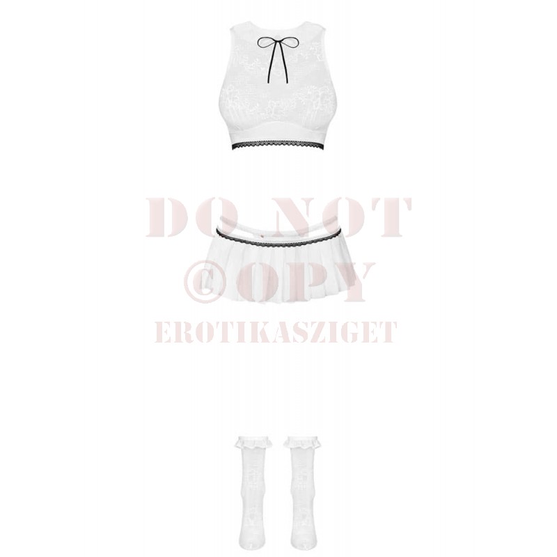 A fehér áttetsző anyaga szexre csábít,miközben a miniszoknya merészen láttatja a popsit.A jelmez tartozéka a tanga és a zokni is.