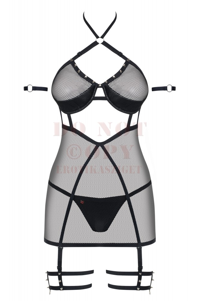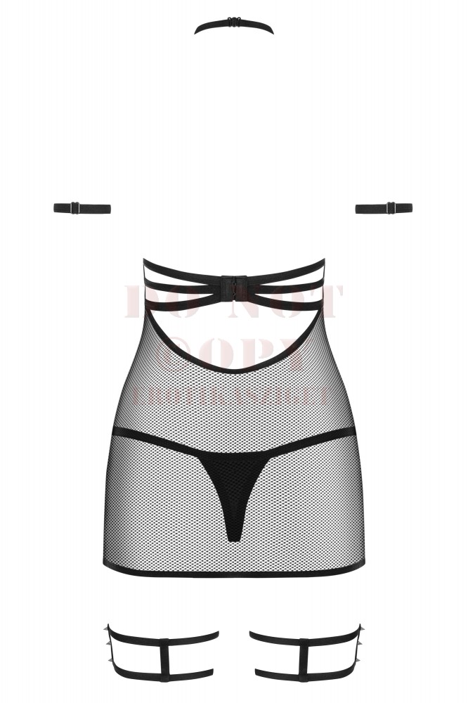 Különleges fazonban megalkotott szexi miniruha combkötővel és hozzá illő tangával.Rugalmas pántok és szegecses betétek teszik extrává ezt a fehérnemű szettet,melyben a csábítás garantált.