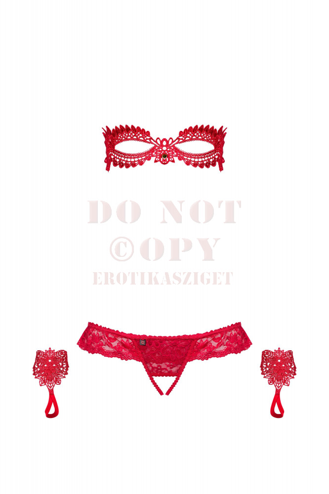 Különleges három részes fehérnemű szett élénk piros színben,akár Valentin napra is! Puha piros csipkéből megálmodott szeméremnél nyitott alsó,piros kesztyű és szemmaszk együttese a Hetea set.