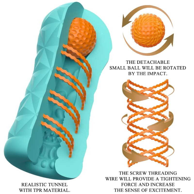 Az újszerű design két fő elemre épül: egy speciális, forgó spirál a maszturbátoron belül, valamint egy oldalsó stimulációs golyó, mely a pénisz megfelelő pontjait izgatja a behatolás során. A spirál mozgása minden húzásnál körkörös érzést kelt, a golyó pedig kiegészítő nyomással, finom nyomkodó hatással egészíti ki a spirál stimulálását.